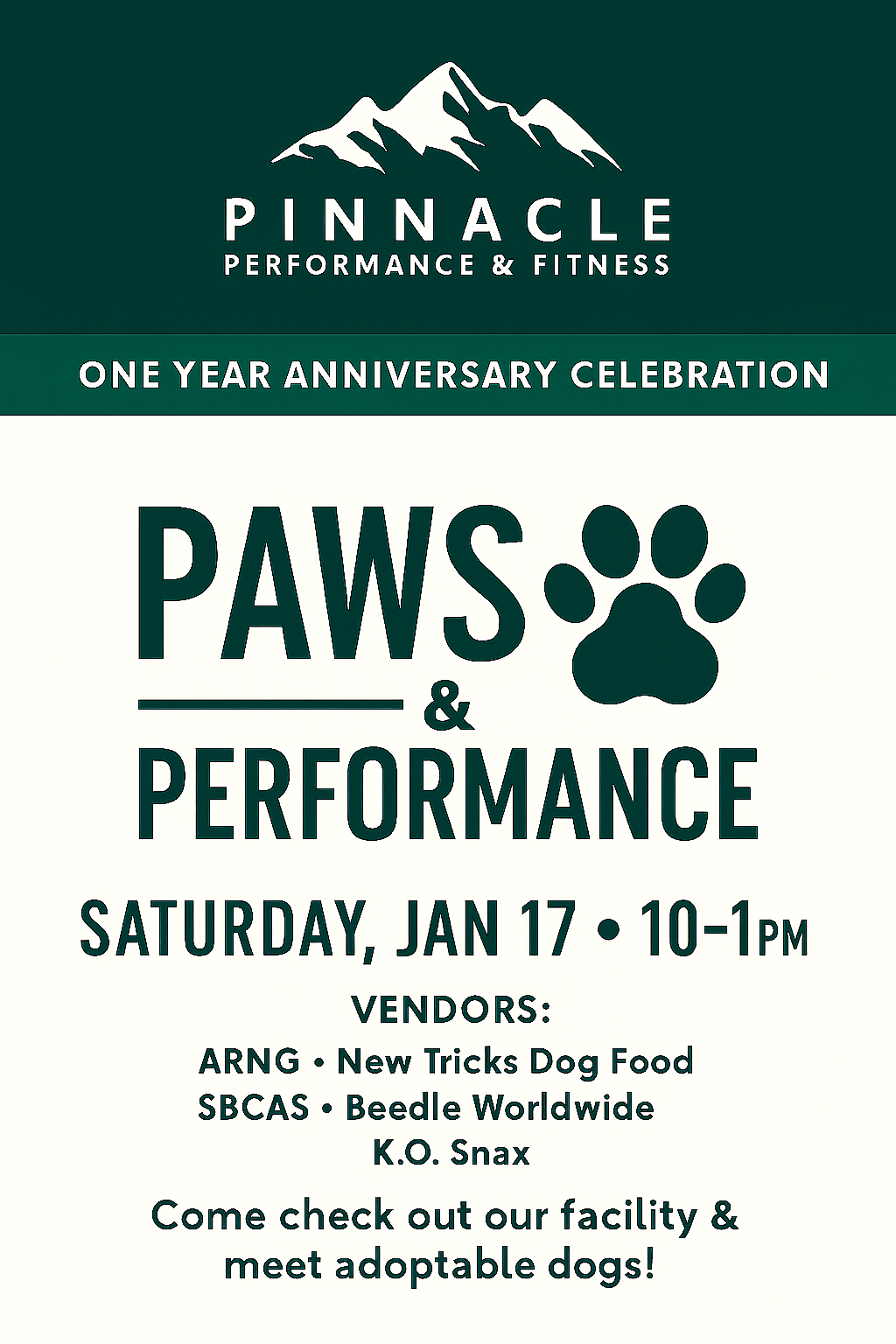 Celebrate one incredible year of strength, community, and results at Paws & Performance, Pinnacle Fitness’s one-year anniversary event!